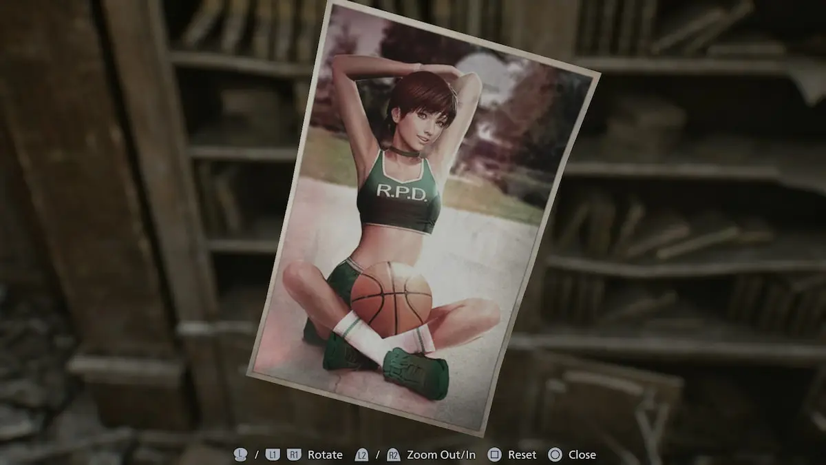 Step three: the book sits on the second floor of the library, on the far side of the bridge. When you grab it and flip through, you’ll find a poster inside — Rebecca Chambers in an RPD uniform, clutching a basketball. Flip it and read the handwriting: Rising Rookie Rebecca.